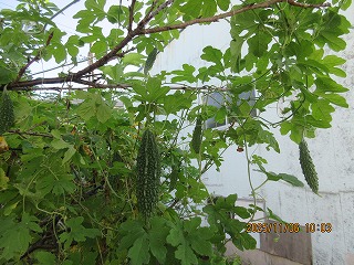 菜園の桜の木の枝に、大小のゴーヤーが何個も下がっていた。