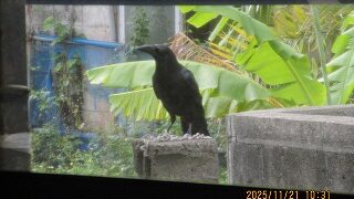 一段落して、椅子に座って外を眺めていたら、桜の木の横にあるブロック塀に黒い大きな鳥が。