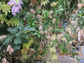 外があまりに暖かそうなので、ちょっと外に出たら、ゴーヤーの蔓が、殆ど枯れかけていた。