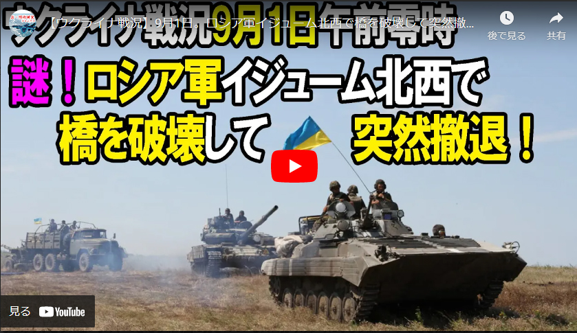 ロシア軍イジューム北西で橋を破壊して突然撤退! 2022年9月2日 最終更新日時 : 2022年9月2日 ibuchanじじ FacebookXBlueskyHatenaCopy Post Views: 5 FacebookXBlueskyHatenaCopy