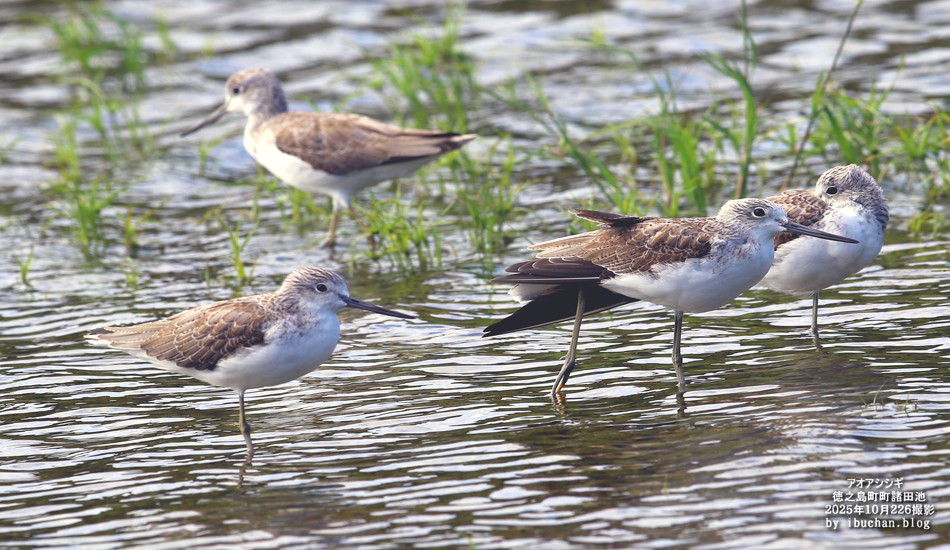 アオアシシギは旅鳥または冬鳥で年間を通して見ることができる。 (2025年10月26日 徳之島町諸田池で撮影)