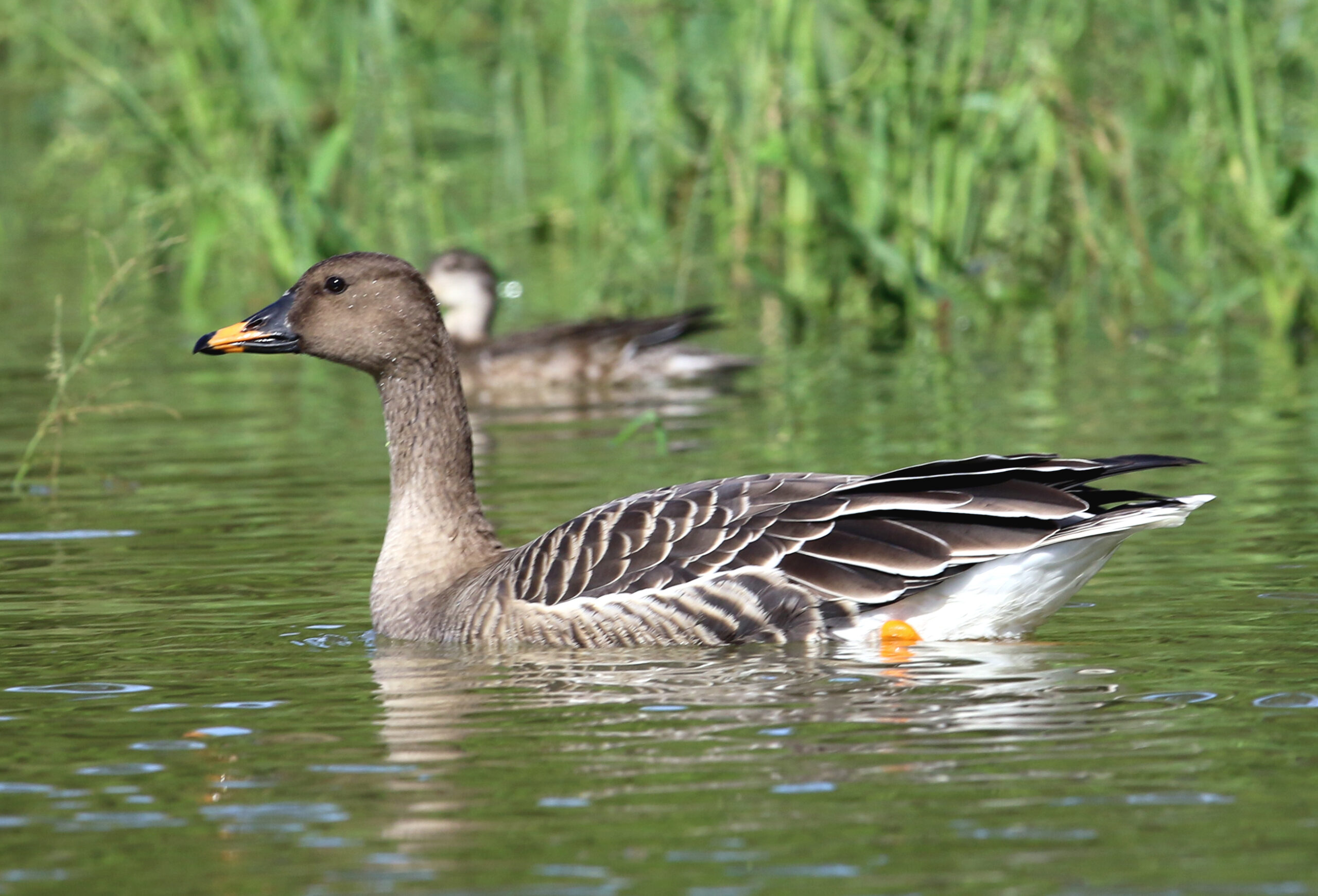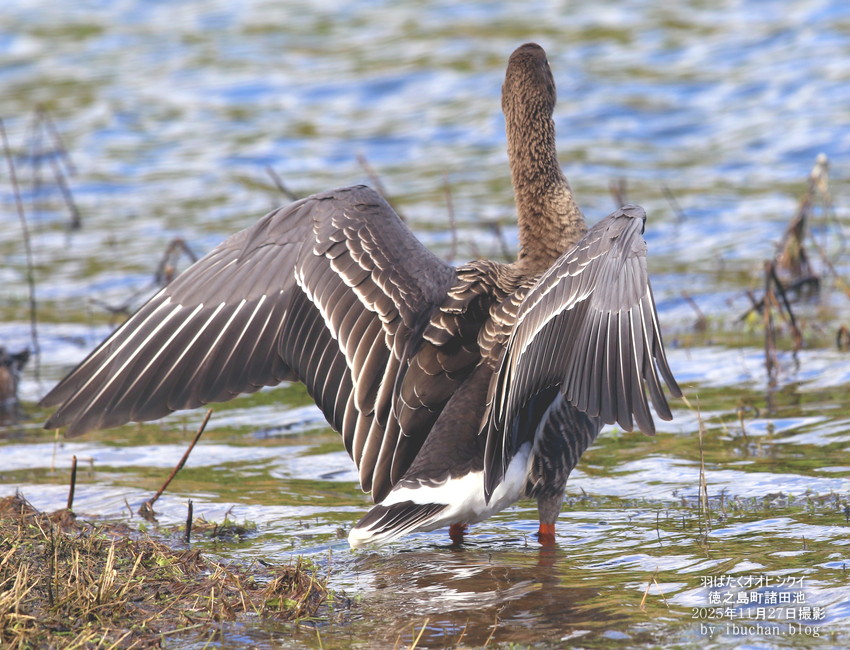 オオヒシクイは迷鳥で不定期に島へ一羽から数羽で渡来する。 翼開長(翼を全開にした長さ)は約2mにとどくというガン類で最大の大きさを誇っている。 絶滅危惧(NT)に指定されている。 (2025年11月27日 徳之島町諸田池で撮影)