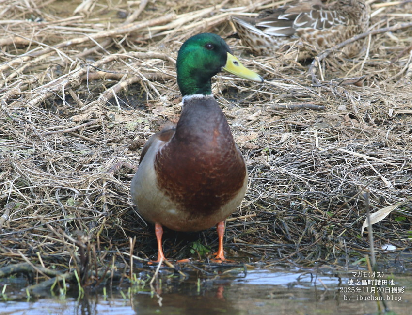 マガモは冬鳥で、この池にも例年数羽が渡来する。 (2025年11月21日 徳之島町諸田池で撮影)