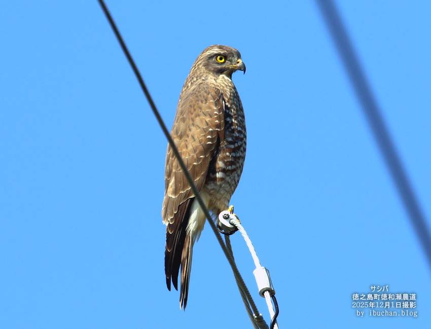 サシバは冬鳥で、農耕地や県道沿いの電線に留まっているのを良く目にする。 (2025年12月1日 徳之島町徳和瀬農道で撮影)