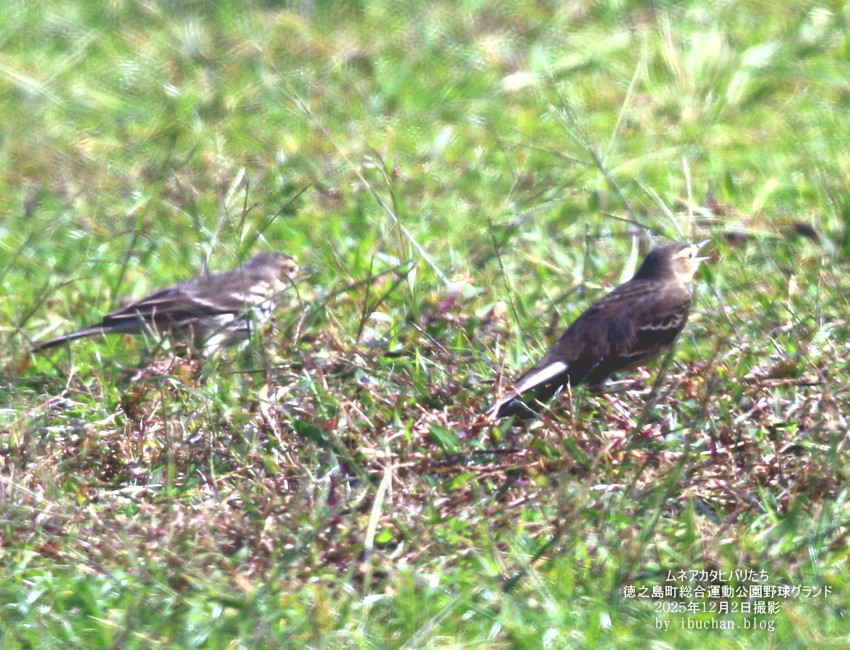 ムネアカタヒバリは冬鳥として島に越冬のため群れで渡来する。 (2025年12月2日 徳之島町総合運動公園野球グランドで撮影)