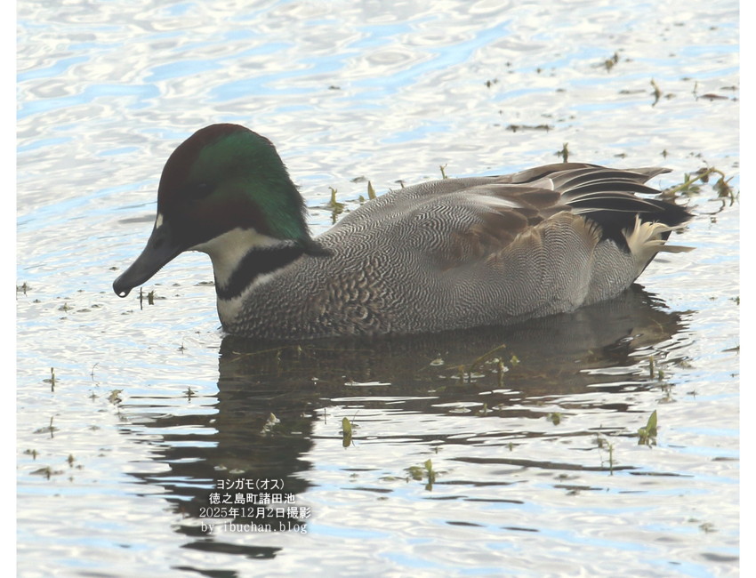 ヨシガモは冬鳥でこの池には数年に一度の割合で数羽が渡来する。 ヨシガモの雄はまるでナポレオンハットを被ったような姿に見えるのが特徴である。 (2025年12月5 徳之島町諸田池で撮影)