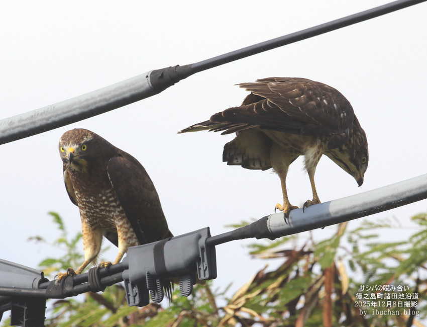 先日、二羽のサシバが睨み合って啖呵を切り合っていた。 サシバは冬鳥で、農耕地や県道沿いの電線に留まっているのを良く目にする。 (2025年11月8日 徳之島町諸田池沿道で撮影)