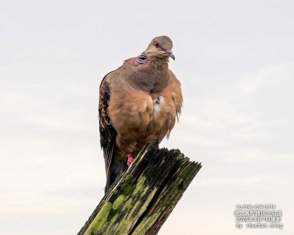 ふと視線を上げると、古い杭の先端にキジバトが羽を休めていました。