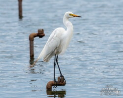 諸田池の旧冷却用噴水口に留まって水辺でじっと獲物を待つダイサギに出会いました。